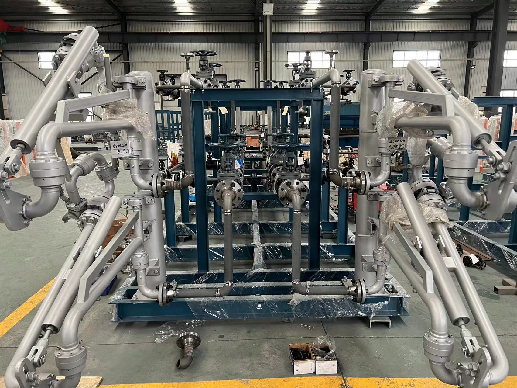 液化烴類介質(zhì)槽車裝車系統(tǒng)比油品槽車裝車系統(tǒng)復(fù)雜,現(xiàn)場組配裝車系統(tǒng),安裝和調(diào)試周期長,質(zhì)量不穩(wěn)定。為克服以上缺點(diǎn),在工廠內(nèi),將裝車系統(tǒng)的儀表和設(shè)備集成在一個(gè)橇裝架上,并完成電氣安裝、強(qiáng)度試驗(yàn)和低溫測試等,裝車橇到達(dá)用戶裝車現(xiàn)場后,接地角螺栓,連接工藝管線、通訊和供電線路就可以使用。結(jié)合液化烴類介質(zhì)裝車橇技術(shù)特點(diǎn),對(duì)液化烴裝車系統(tǒng)中的設(shè)計(jì)數(shù)據(jù)、功能要求、操作方法進(jìn)行敘述,綜合國內(nèi)裝車系統(tǒng)在使用中出現(xiàn)的問題提出了解決辦法。以下為公司近期液化烴類裝車撬的生產(chǎn)現(xiàn)場。