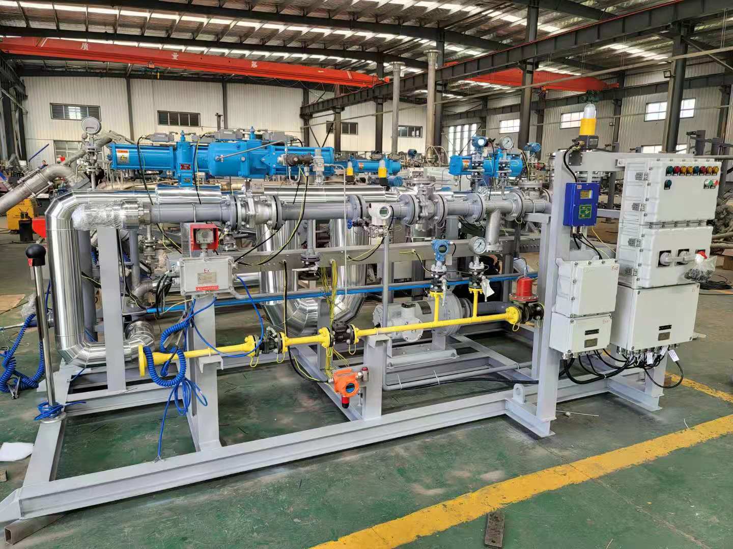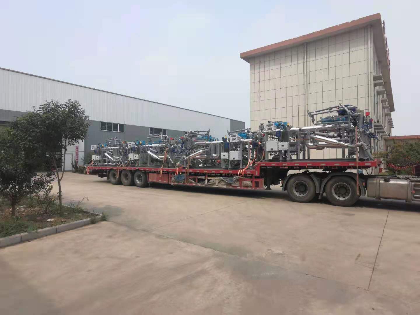 油品及化工品定量裝車橇裝組是指將每一個裝車鶴位內的儀表和設備集成在一個專用的框架結構內,儀表和設備包括裝車鶴管、流量計、防溢油靜電報警控制器、壓力變送器、裝車流量控制閥、緊急切斷閥,裝車泵、批量控制器等, 只預留工藝連接口和控制電源和通訊接口,這個整體集成部分稱為裝車橇。與傳統(tǒng)的裝車控制系統(tǒng)就地組裝比較,裝車橇可以節(jié)省現場設計和現場施工量,縮短項目工期,提高裝車控制系統(tǒng)的質量。以下是近期公司定量裝車撬的生產及發(fā)貨現場。